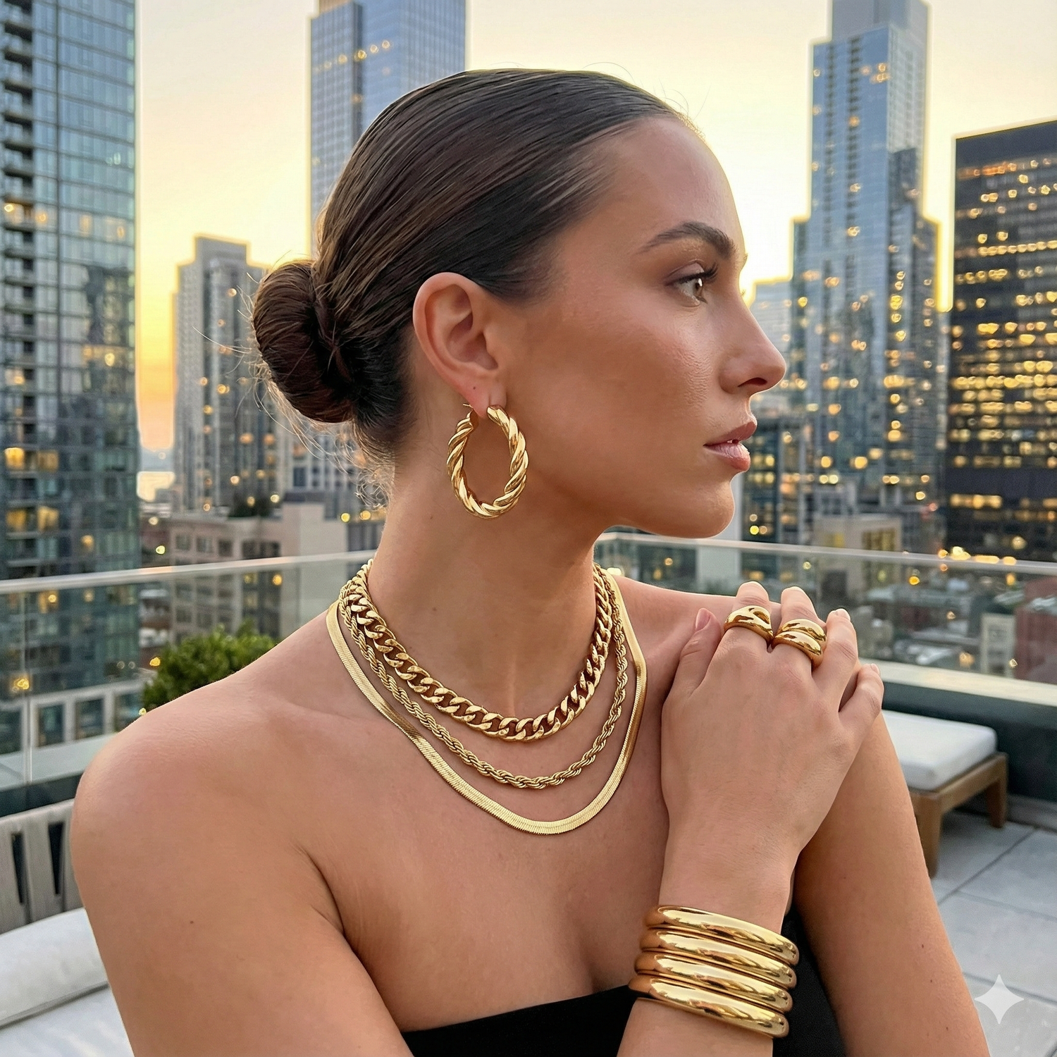 Olvídate de pensar qué ponerte. La magia del estilo Chunky es que hace todo el trabajo por ti. Una polera blanca, tus joyas Hera y estás lista para conquistar el mundo.