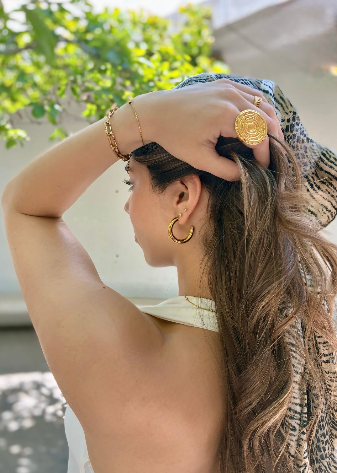 Fabricados en acero inoxidable, enchapados en oro de 18K, son hipoalergénicos y waterproof, ideales para acompañarte siempre con carácter y sofisticación.