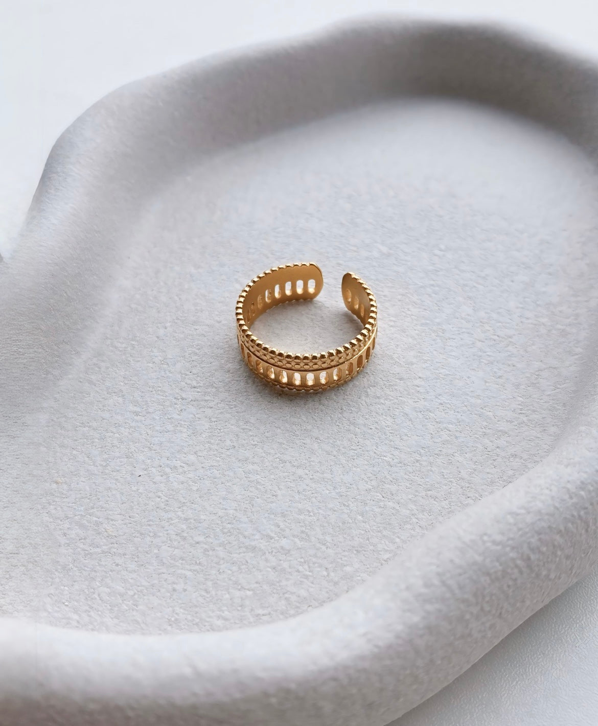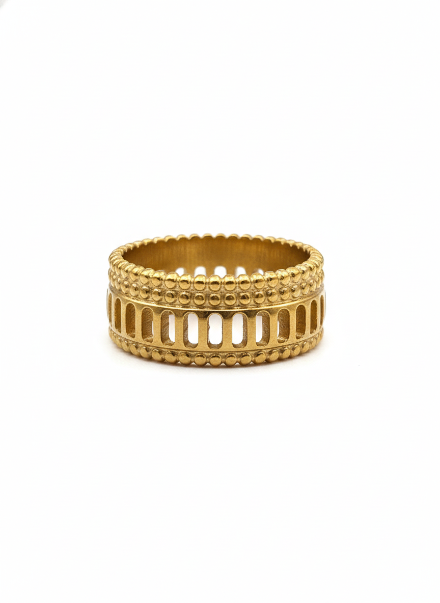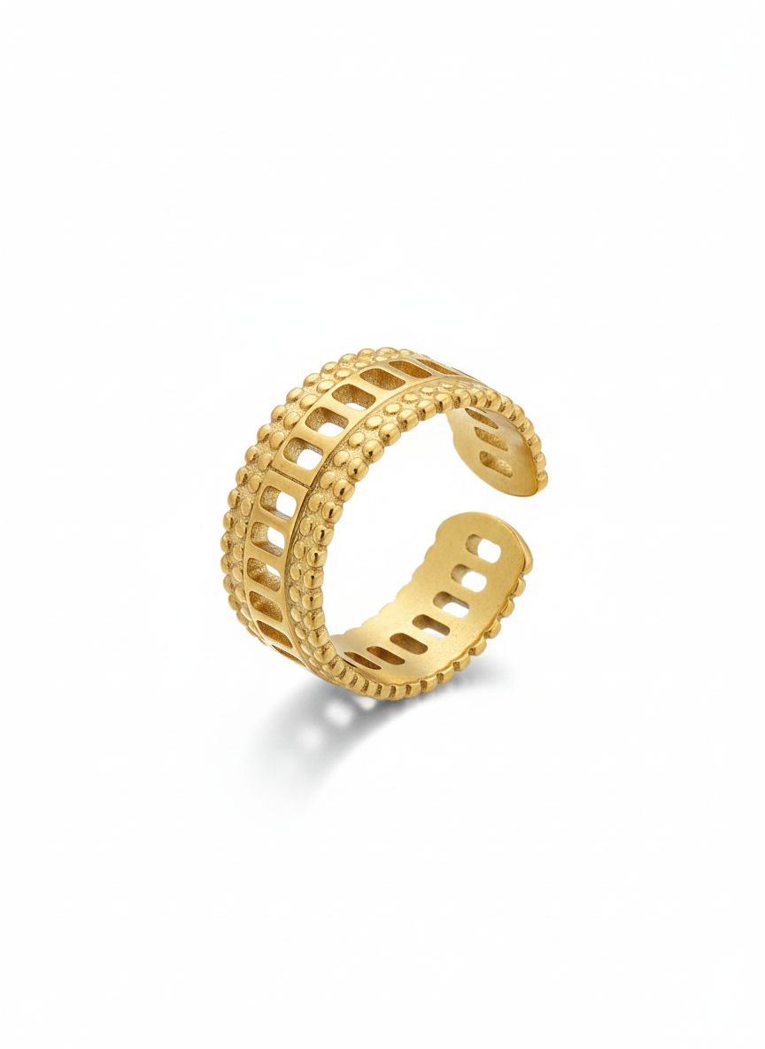 Fabricado en acero inoxidable, enchapado en oro de 18K, es hipoalergénico, waterproof y ajustable, creado para adaptarse a ti con carácter y elegancia.